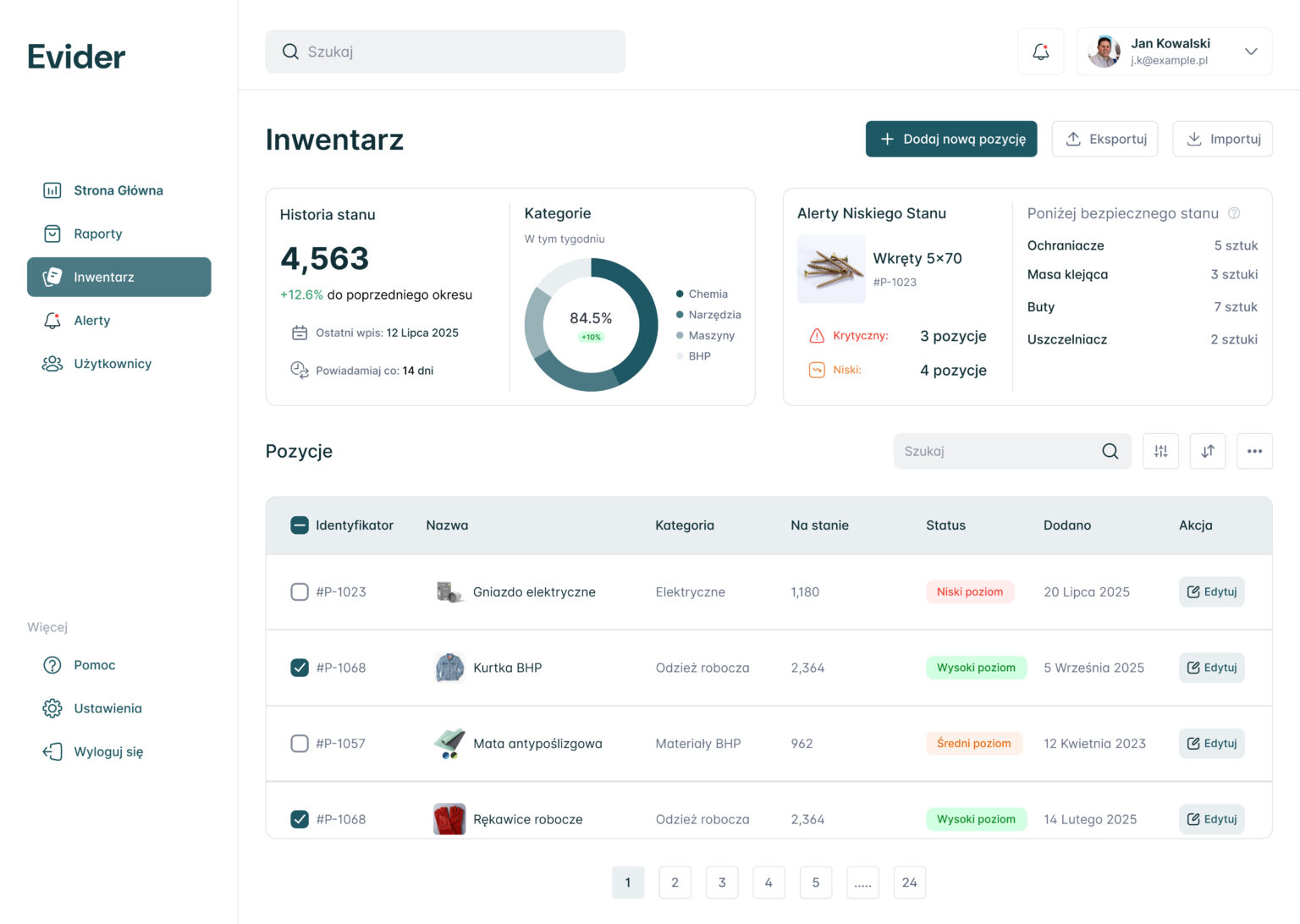 Twórz raporty dotyczące stanów magazynowych, historii zmian oraz aktywności.